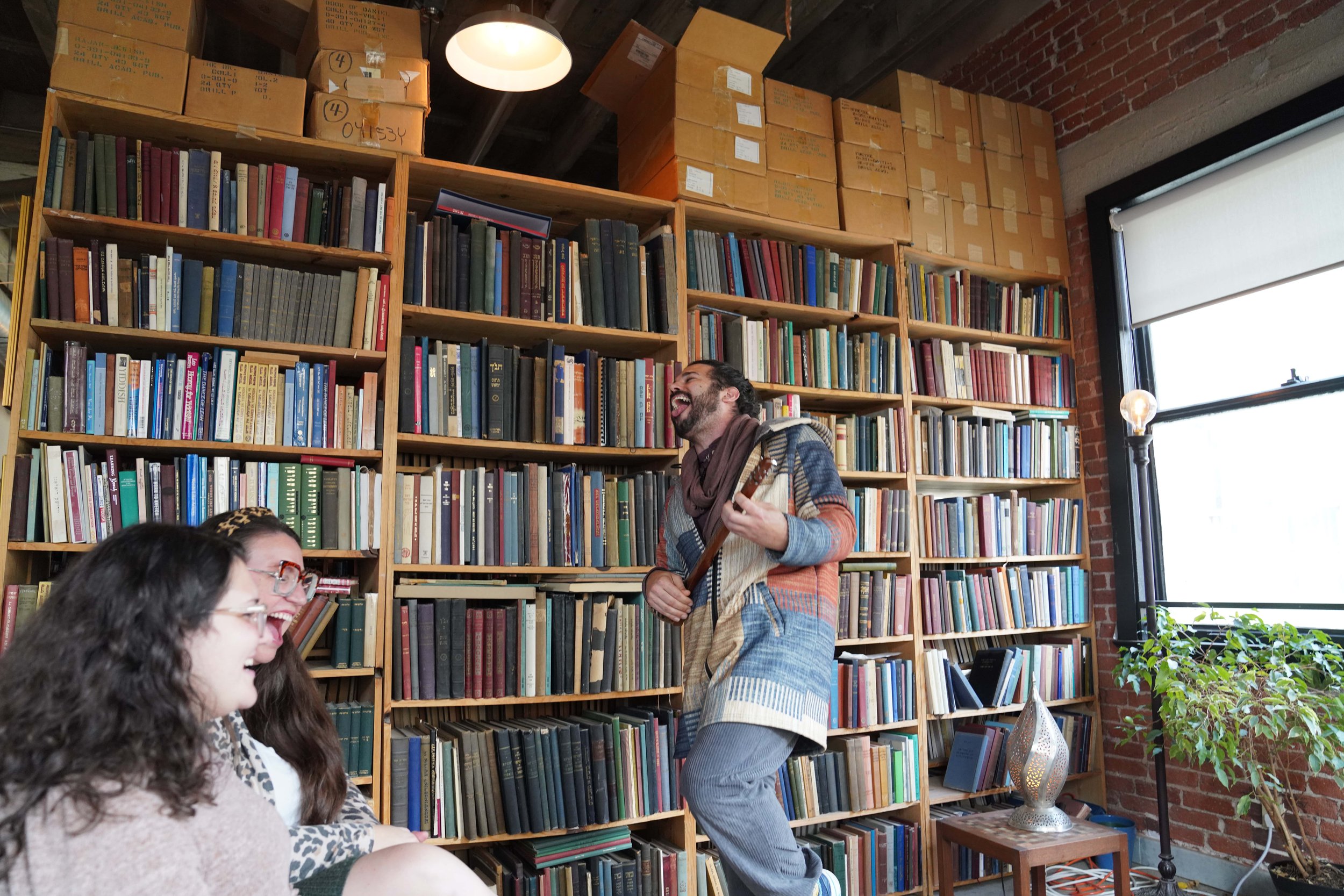 This was an event that began again and again, opened and reopened. First, a word about the space. Der Nister is named for the pseudonym of Pinchus Kahanovich, a mystical Yiddish writer; it means “The Hidden.” Entering Der Nister feels like walking into a magical realist Yiddish book store on the Lower East Side of Manhattan a century ago. Rows of shelves hold a dizzying array of Jewish books that whisper, summon, entice, and hide in enigmatic defiance. A wall of vinyl preserves the melodies of a still-unfolding exile. At one end, our audience sat in folding chairs on a patterned rug while the muted sunlight of a winter afternoon lit the exterior walls of old downtown Los Angeles.